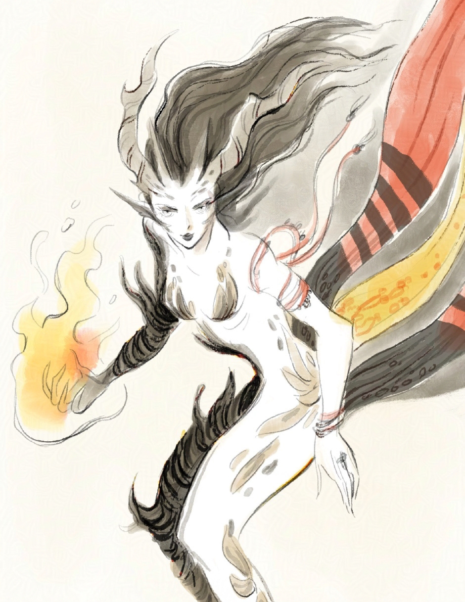 White demon-like figure with colorful scarves